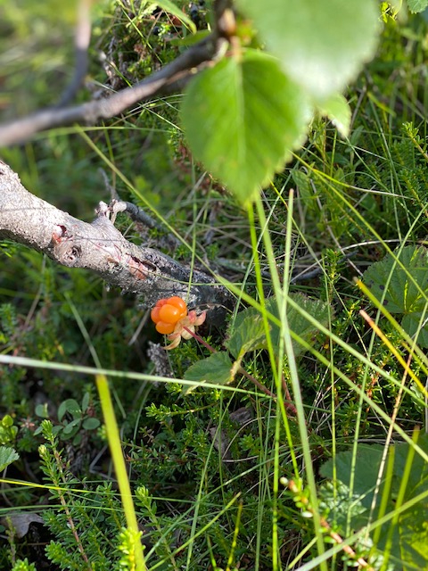 Roligt att plocka hjortron när de är mogna. Vissa lossnar med ett litet plopp, medan bär som detta landar mjukt i handen som en puss.